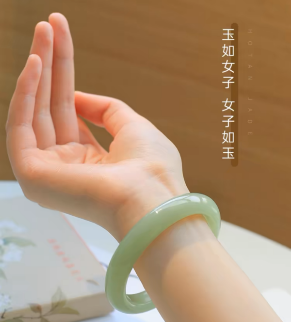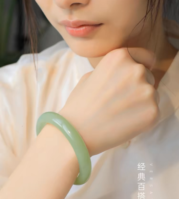 Natural Hetian Jade Bangle for Women – featuring a light green, icy translucent quality with a youthful appeal, crafted from Qingshui jade in soft, pale green tones.