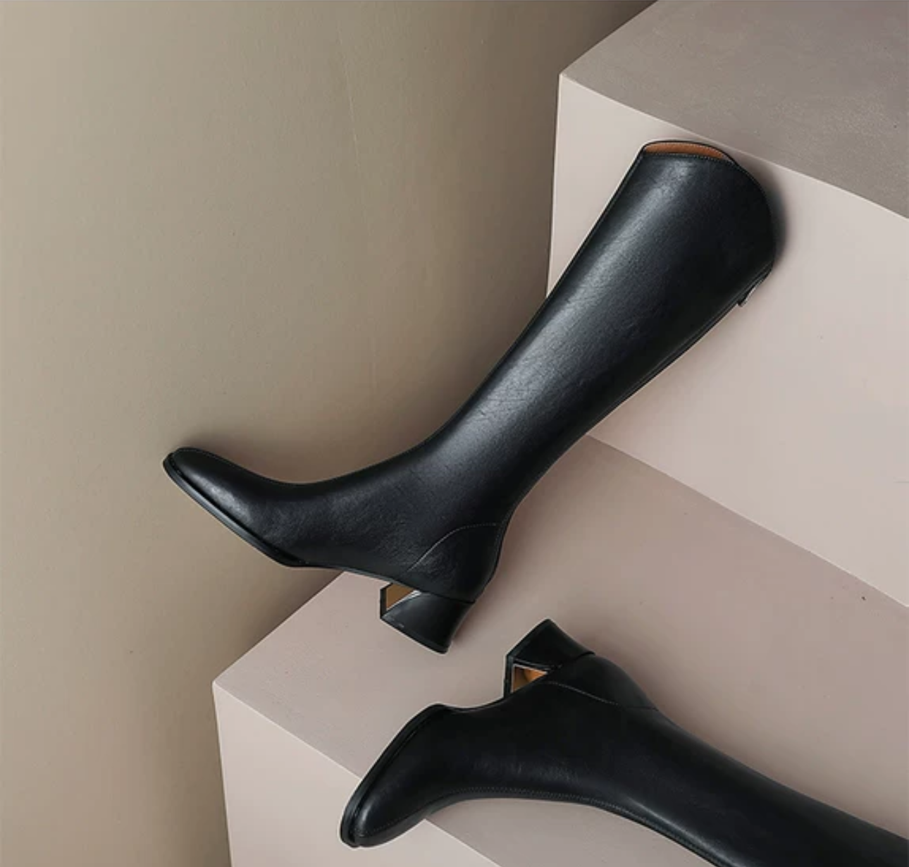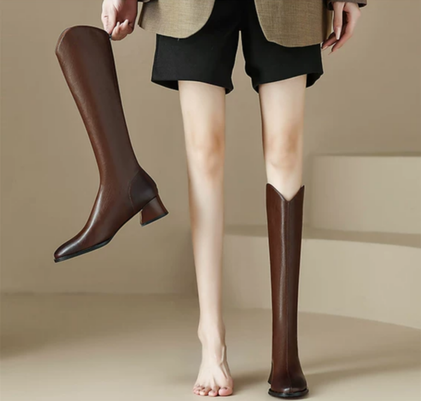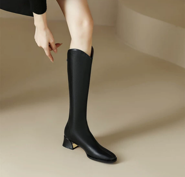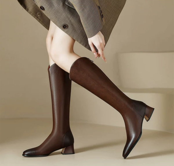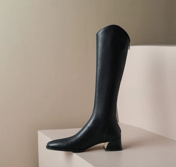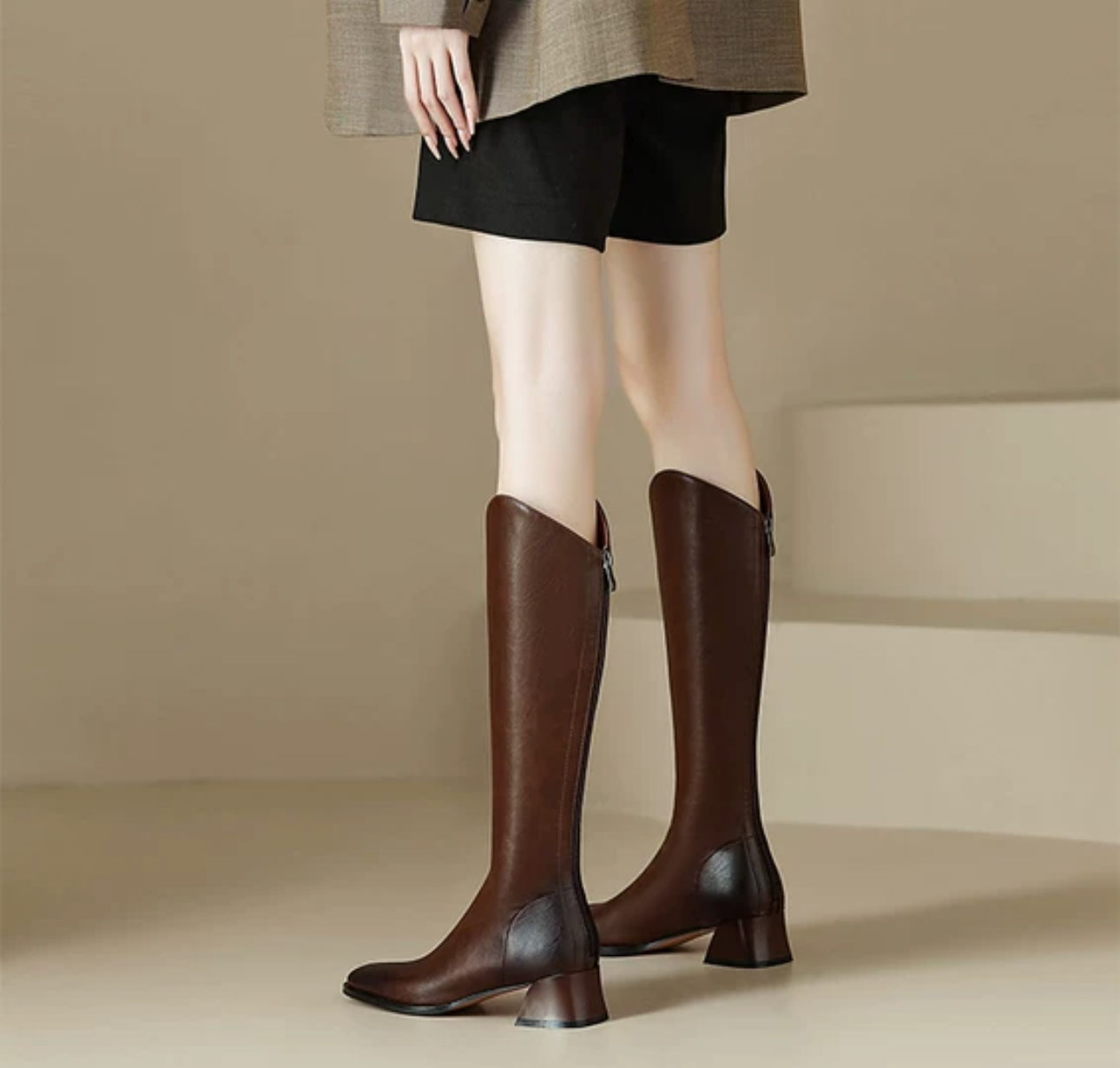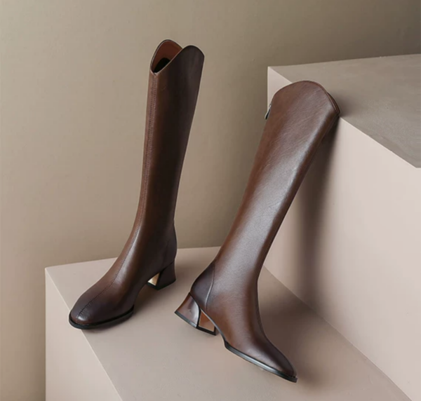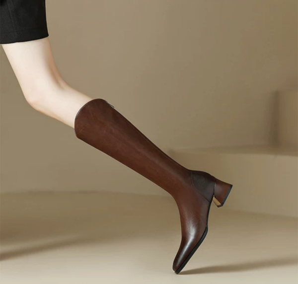 Genuine leather vintage British style chunky-heeled side zipper western knight boots for women.