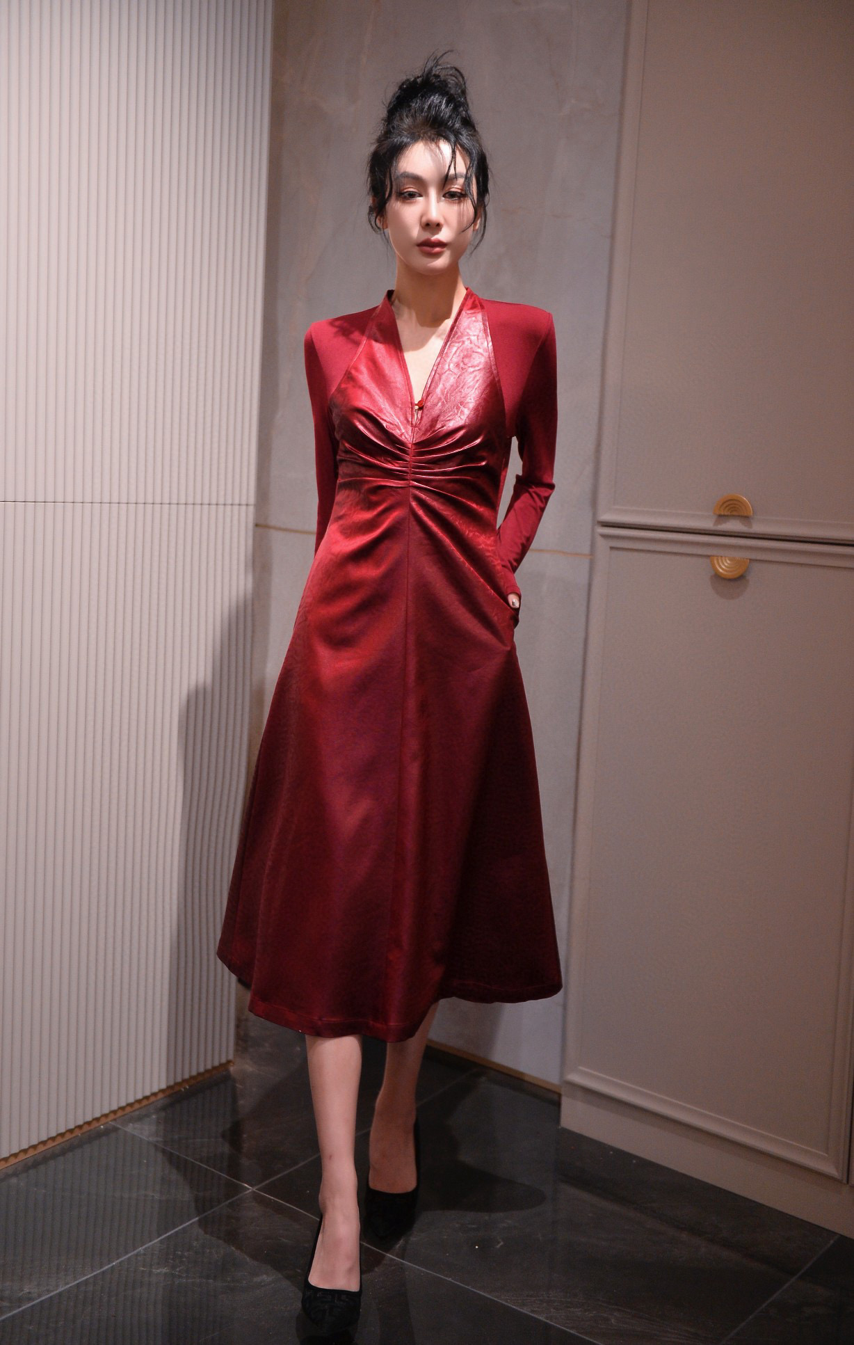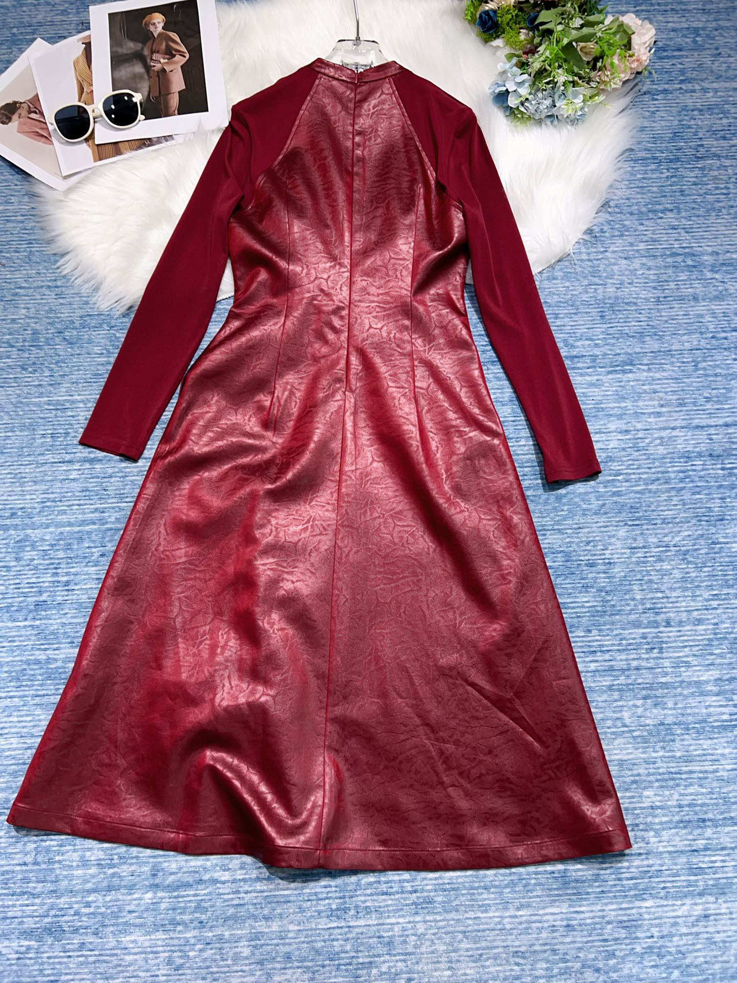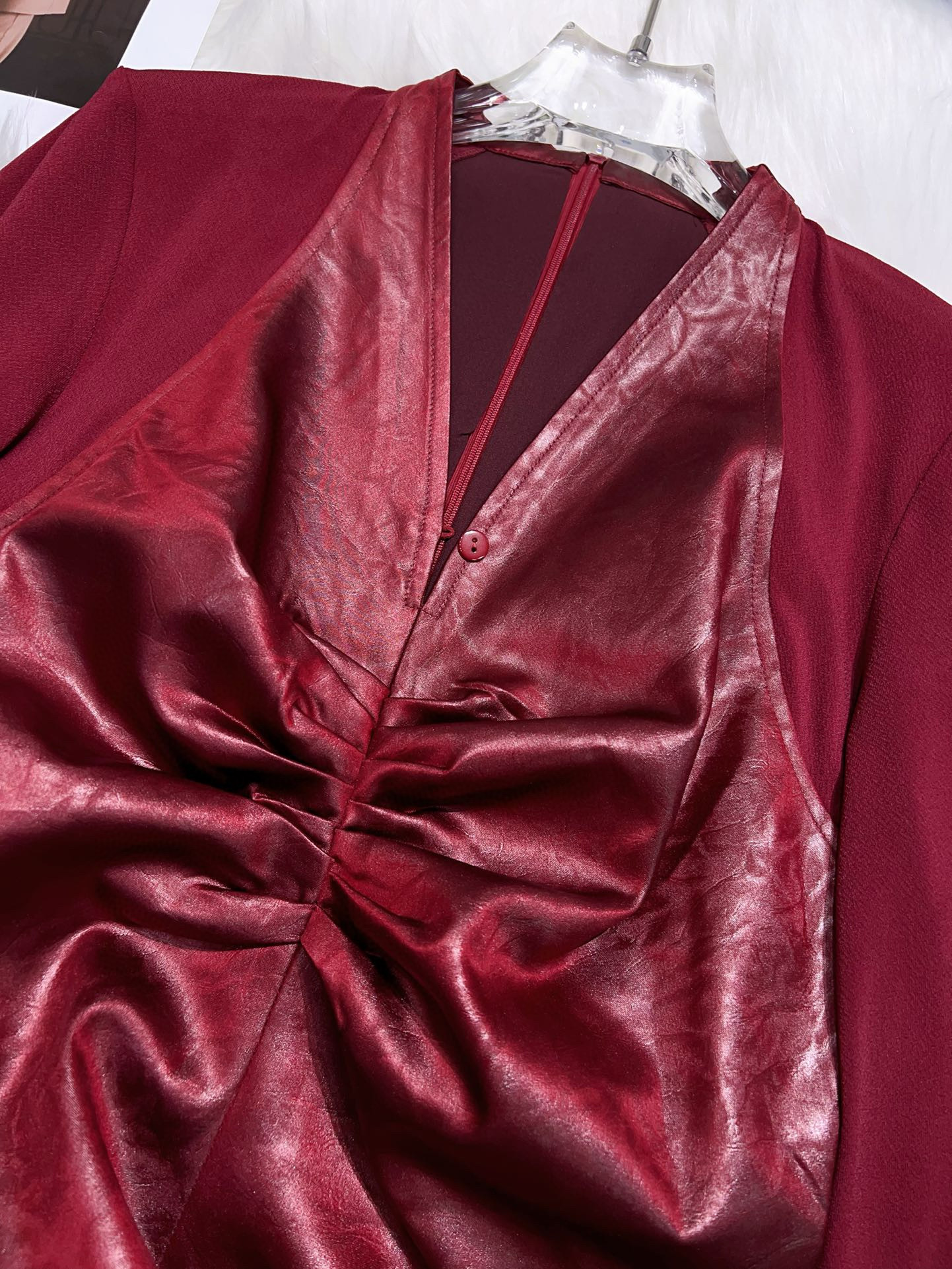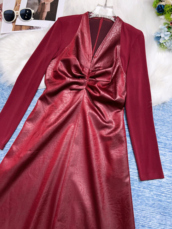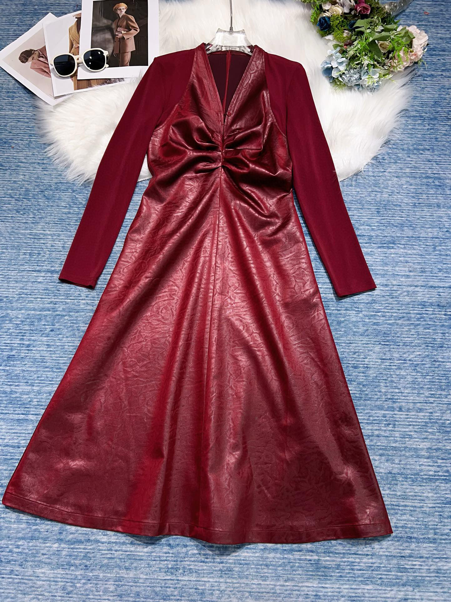 Fashionable bestseller, new high-end slim-fitting, figure-flattering, elegant and affordable V-neck PU spliced dress for women.