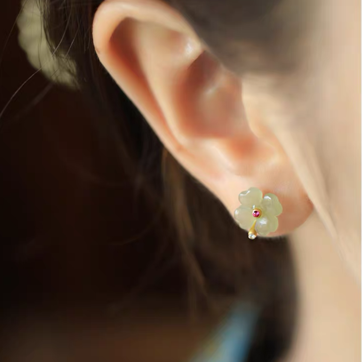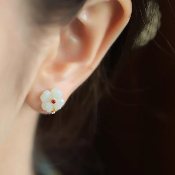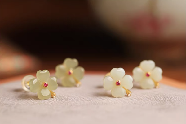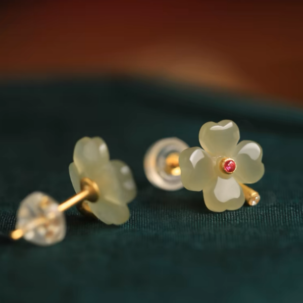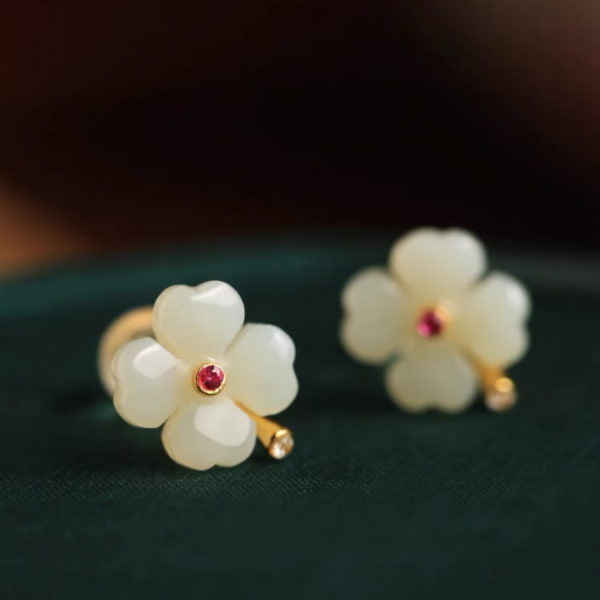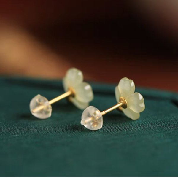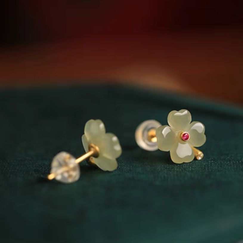 Hetian jade sterling silver four-leaf clover stud earrings for women, summer new Chinese-style jade green earrings, birthday gift.