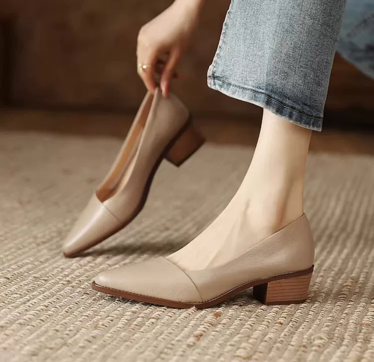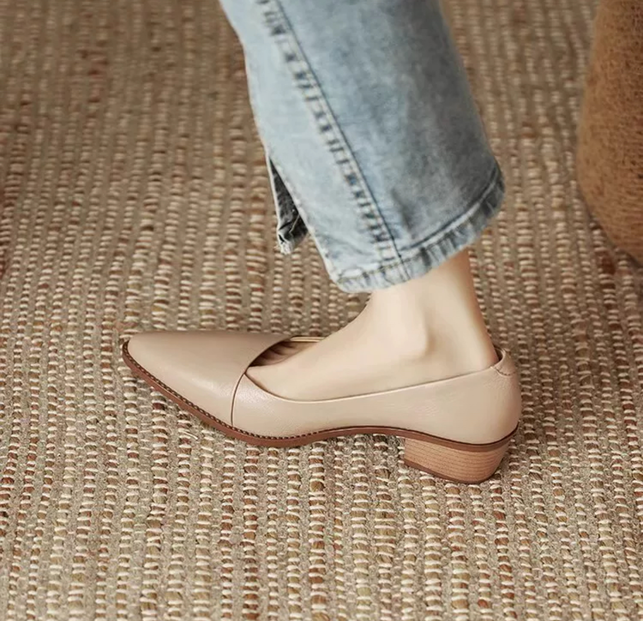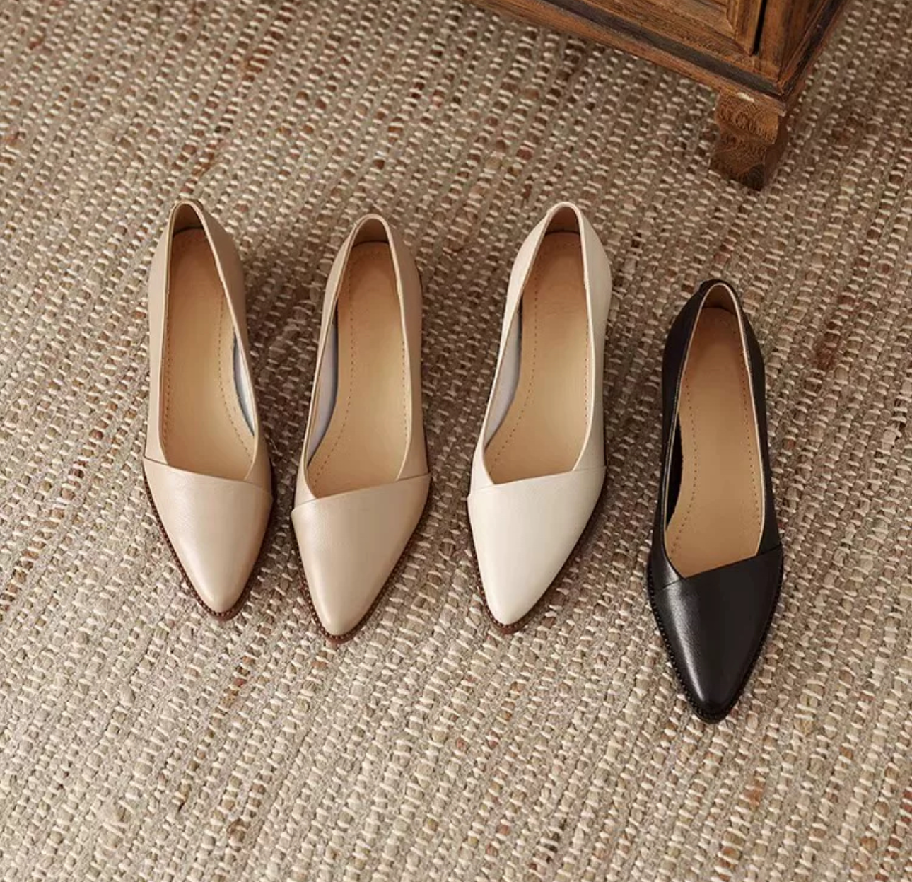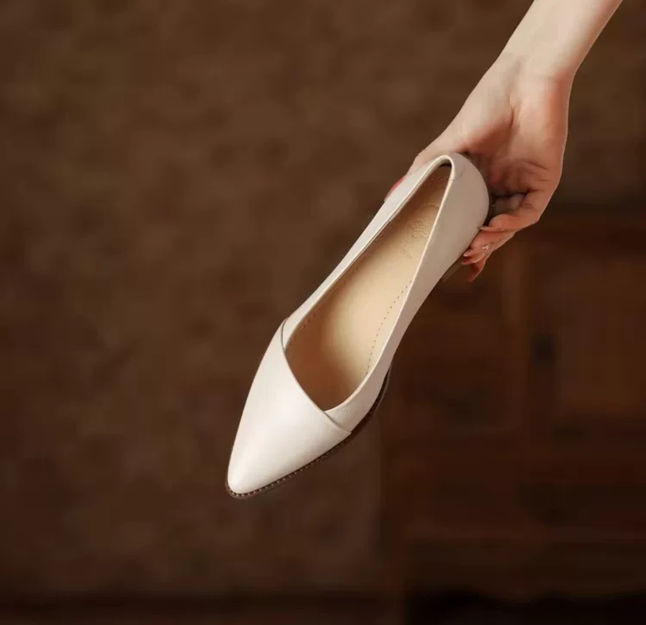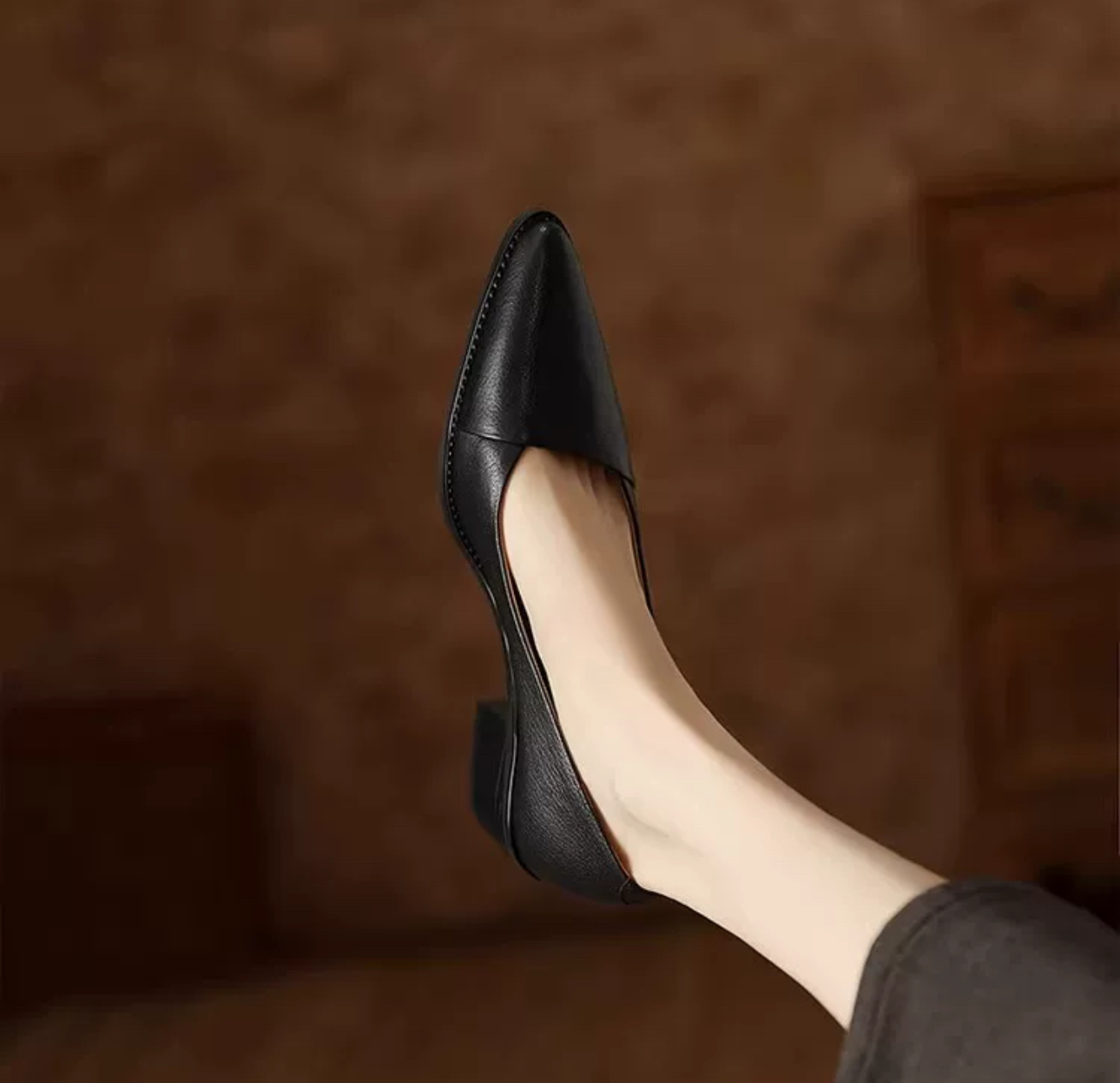 Soft leather loafers with a mid-heel, spring and autumn versatile and fashionable slip-on pointed toe flats, shallow mouth, women’s leather shoes.