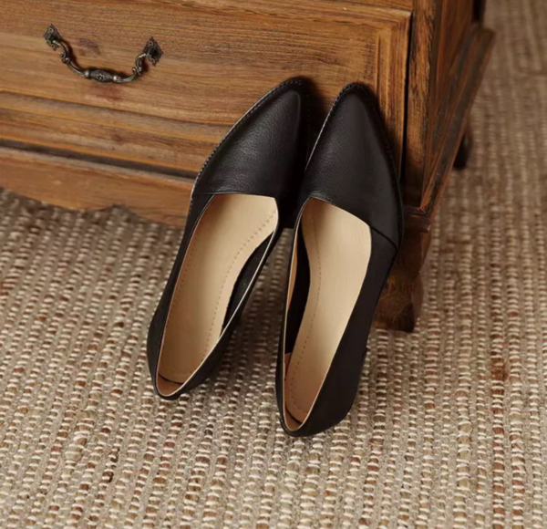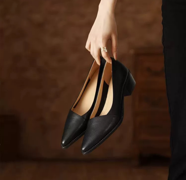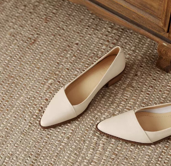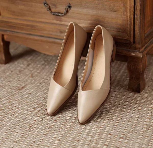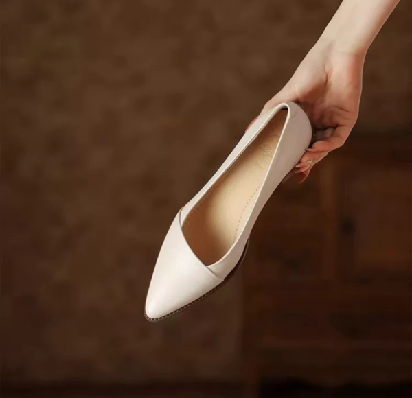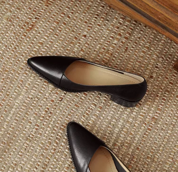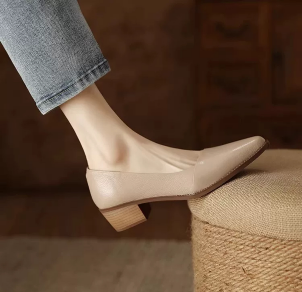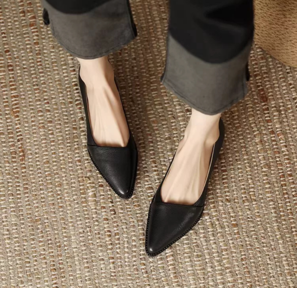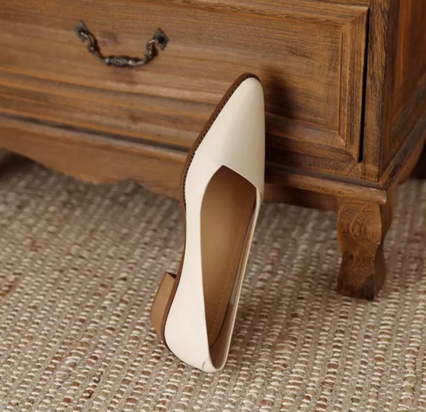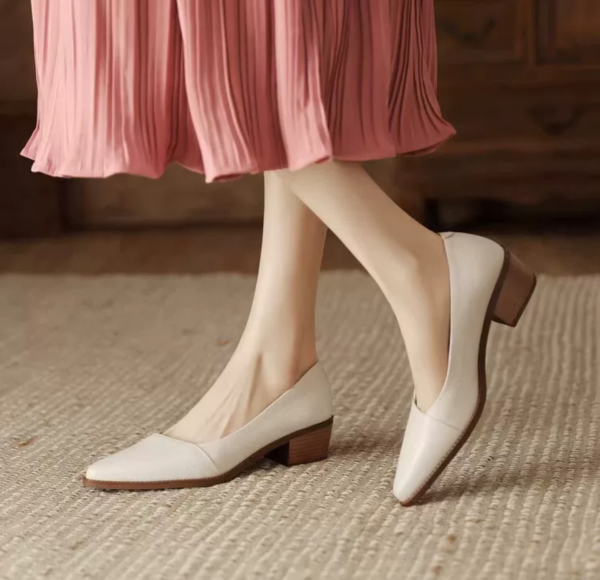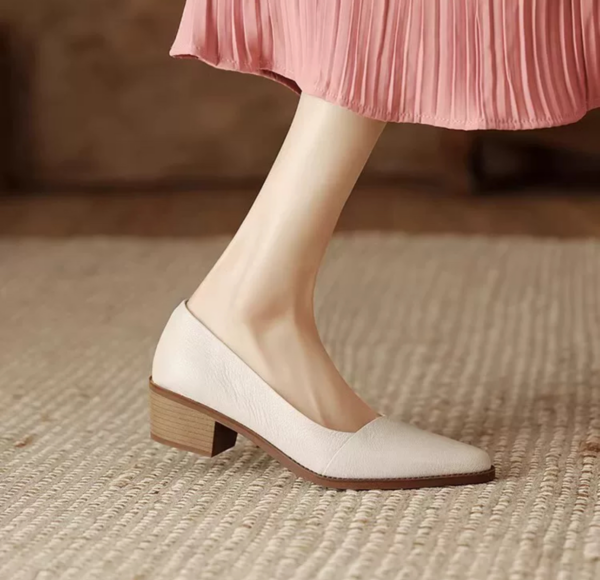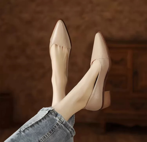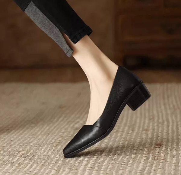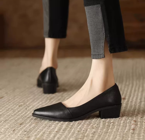 Soft leather loafers with a mid-heel, spring and autumn versatile and fashionable slip-on pointed toe flats, shallow mouth, women’s leather shoes.